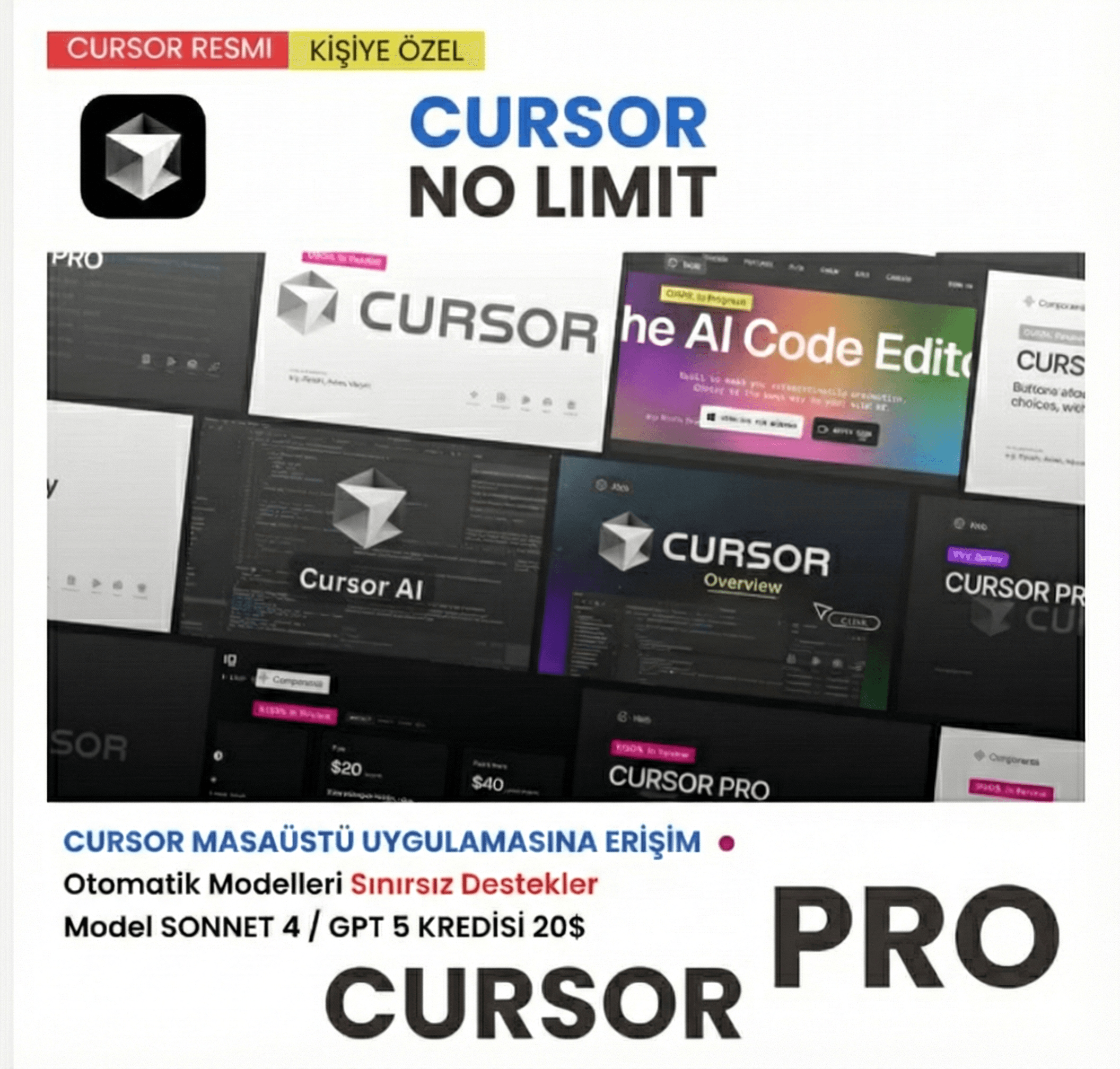 VS Code altyapısı üzerine kurulu, yapay zeka ile güçlendirilmiş Cursor AI editörüne paylaşımlı hesap avantajıyla sahip olun.